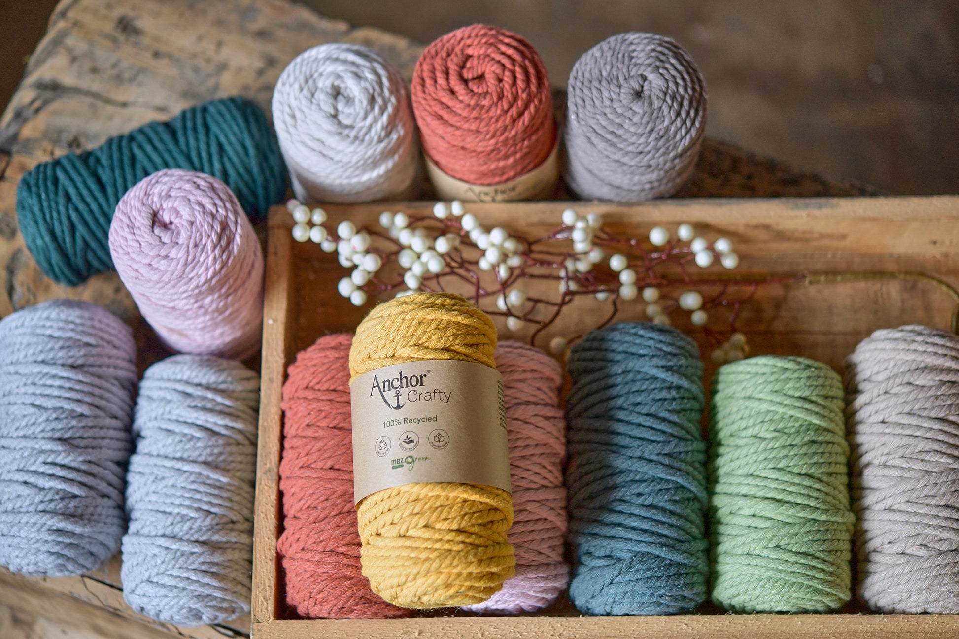 5mm thick, twisted rope-like crochet yarn made from recycled waste textile and plastic materials. 80% cotton, 20% polyester. Perfect for macramé projects such as plant hangers and wall hangings, but can also be used for crochet, knitting and other yarn crafts. Wash at up to 60°C. Do not tumble dry. Dry flat. Iron at high temperature. Use a softener to preserve the natural softness of yarn.